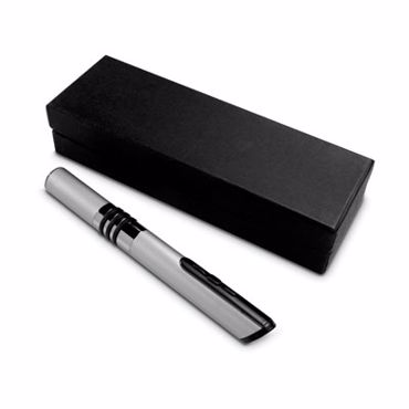 Pointeur laser télécommandé PRESENTO. Stylo pointeur laser à télécommande intégrée. Corps métallique avec 3 anneaux de caoutchouc pour une meilleure préhension. L'emballage individuel de carton noir comprend 6 piles de type bouton ainsi qu'une étiquette de conformité pour laser de classe II.