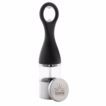 Moulin à poivre et sel en inox et plastique avec décapsuleur.