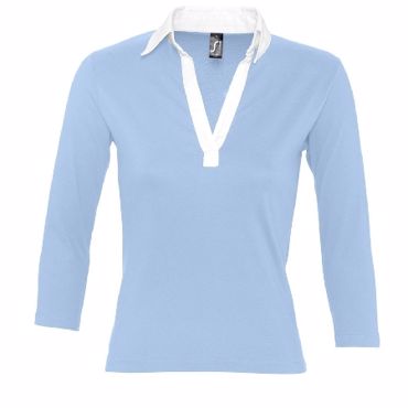 100% coton peigné Bande de propreté au col Col et patte en twill de coton blanc sans boutons Manches 3/4 Coupé cousu Polo rugby féminin en coton peigné