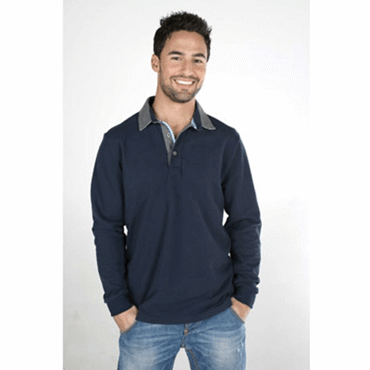 POLO MANCHES LONGUES - 100% coton peigné lourd. Maille piquée. Coupe cintrée. Dessus de col en piqué, dessous de col en twill 100% coton avec passepoil contrasté en chevrons. Boutons métalliques aspect mat.