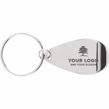 Porte-clés en métal avec décapsuleur présenté dans une boîte cadeau.