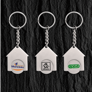 Porte clés jeton "maison". Base zamac injecté, finition de l'ensemble nickel satin. Dimensions : 40x35 mm, épaisseur 5mm. Prix incluant un émaillage du jeton de 1 à 4 couleurs sur le recto. Délai 5 semaines.
