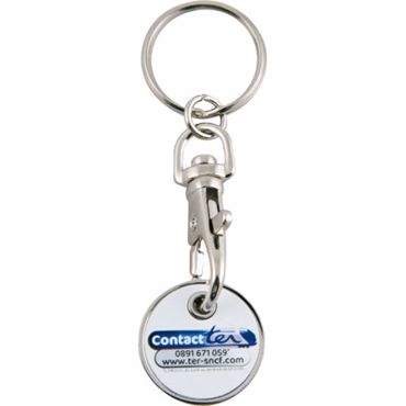 Porte clés jeton quadri. Porte clés avec mousqueton + jeton métallique. Finition de l'ensemble nickelée, polissage miroir de toutes les faces. Prix incluant une impression du jeton quadri sur le recto. Pour marquage quadri au verso nous consulter.