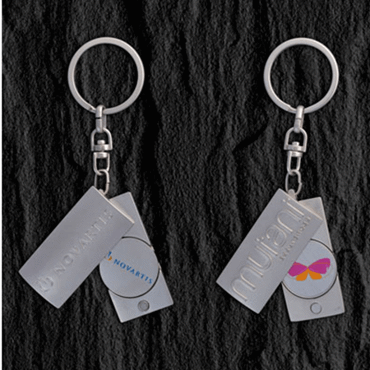 Porte clés TOTEM jeton. Base zamac injecté, finition de l'ensemble nickel satin. Dimensions 46,5x22,4mm, épaisseur 7,5 mm. Prix incluant une personnalisation du Totem au recto en gravure ou en relief + émaillage du jeton de 1 à 4 couleurs sur le recto. Attache tournante. Délai 5 semaines.