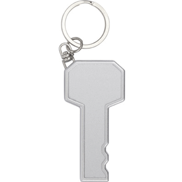 Porte clés lampe forme de clef. Porte-clés en plastique muni d'une LED blanche et d'un anneau brisé, pile comprise.