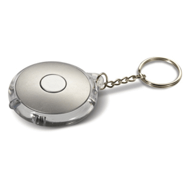 Porte-clés rond avec bouton pression et face transparente. Piles incluses.