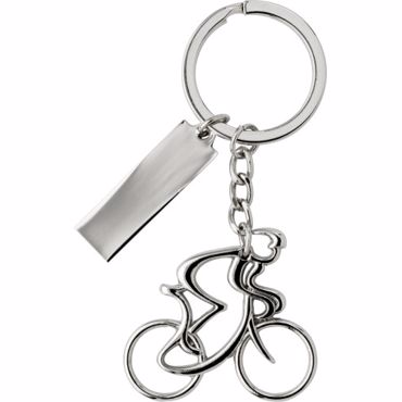 Porte-clés 'cycliste' en métal muni d'une plaque pouvant être gravée.
