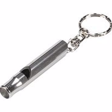 Porte clés sifflet. Sifflet en aluminium avec anneau en métal. argenté, bleu, rouge, gris