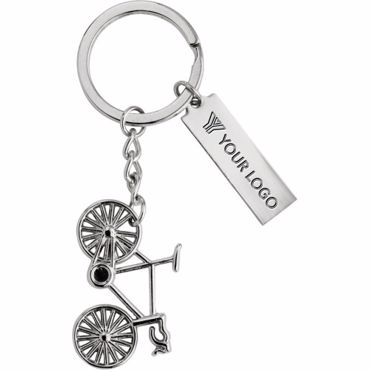 Porte-clés 'bicyclette' en métal muni d'une plaque pouvant être gravée.