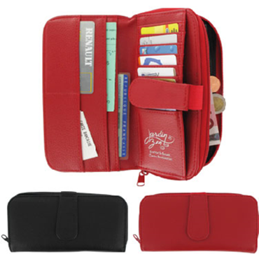 Portefeuille. Compagnon, idéal pour sac à main, multi compartiments, avec soufflets et fermeture zip, en simili cuir haut de gamme. Coloris noir et rouge. Marquage en 1 couleur.