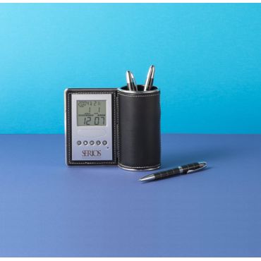 Pot à crayons en PU et métal avec fonctions pendulette, thermomètre, calendrier, piles incluses.