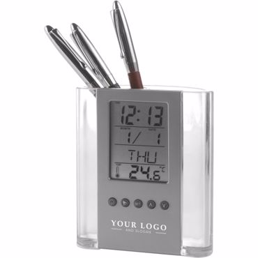 Pot à crayons en acrylique translucide avec fonctions pendulette, thermomètre, calendrier et alarme, piles incluses.