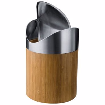 Poubelle de table très design en bambou et métal chromé avec couvercle à bascule.