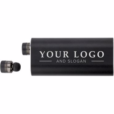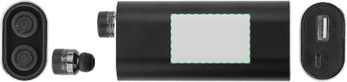 Power bank muni d'écouteurs rechargeables et d'une batterie Li-ion d'une capacité de 4000 mAh, une entrée de 5V/0,9 et une sortie de 5V/1A, inclus un câble de charge.