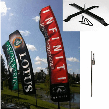 PRO-WING "BANNER FLAG" 560 CM XL-Les Wing Flags de 250 a 590 cm de haut avec de multiples formes "Blade, Petale, Surf, T-Flag, Banner et Croissant" sont vendus en KIT. Le qui conciste de l'impression sur maille 115 gr, le mat en fibre de carbonne renforce aluminium, d'un pied en croix acier 3.5 kg avec axe rotatir ou d'un pied piton acier avec axe rotatir et d'un sac de transport. Ces kits sont devenue le mode favoris pour les points de ventes et evenements pour creer du dynamism et attirer les regards. Ils prennent peu d'espace au sol pour un grnd espace d'affichage. A partir de 10 pièces, prix sur devis également disponible en coton (drapeau)et aluminium (support)