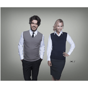 PULL SANS MANCHE COL V UNISEXE QUALITÉ : JERSEY 280 50% coton - 50% acrylique STYLE : CLASSIQUE Emmanchures et bas en bord côte 1x1 avec fil élasthanne pour une meilleure elasticité Emmanchures à diminutions Coupe droite