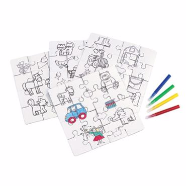Puzzle à peindre. Puzzle enfant ""Paint your picture"" : comprend 4 puzzles différents (avec motifs à colorier) et 4 feutres, dans un sachet plastifié.
