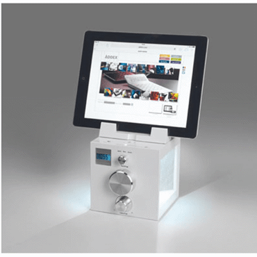 Station d'accueil pour tabletteet Smartphone, radio digitale AM/FM, haut-parleur stereo lumineux, alimentation par USB ou par piles (3 piles LR6 incluses) - dim.130x130x130mm