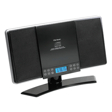 Radio-réveil FM stéréo à affichage digital des fréquences, lecteur CD programmable 20 titres, ouverture verticale, touches sensitives, fixation murale ou sur socle, réveil par radio, CD ou buzzer, entrée aux., prise casque, 2 HP stéréo