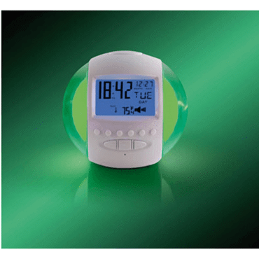 Radio reveil FM, sons de la nature, boitier lumineux, couleurs changeantes, calendrier et temperature (3 piles LR6 non incluses) - dim.125x120x100mm
