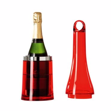 Seau à glace et rafraichisseur bouteille. Ensemble 4 pièces en acrylique translucide, un seau double paroi avec liquide réfrigérant à congeler, un couvercle pour le transformer en refroidisseur, un couvercle plat, une pince à glaçons