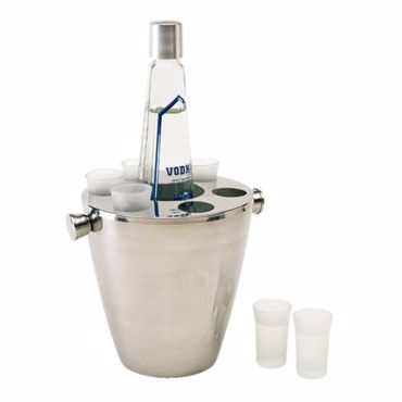 Rafraîchisseur inox pour bouteille "Nastrovje" avec poignées latérales, couvercle démontable et supports 6 verres schnaps, verres incl., dans un emballage cadeau