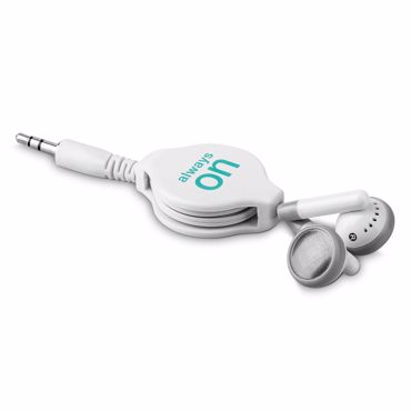 Écouteurs audio en plastique avec mécanisme auto-enrouleur. Connecteur Jack 3.5 mm, câble de 0.8 m. 120 x 30 x 13 mm