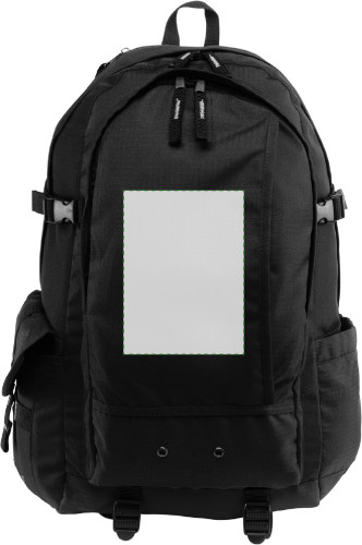 Sac à dos déperlant en polyester ribstop 600D comprenant 2 poches latérales dont une pour une bouteille et une poche frontale zippée.