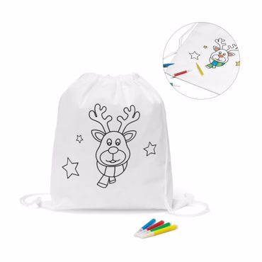 Sac à dos pour colorier. Non-tissé: 80 g/m². Avec dessin imprimé et poche intérieure. 4 feutres inclus.300 x 350 mm