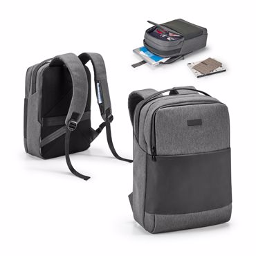 Sac à dos pour ordinateur. 600D oxford haute densité et simili cuir. Imperméable, résistant à l’étirement, au rétrécissement et autres déformations. Avec 2 compartiments. Compartiment postérieur avec division rembourrée pour ordinateur 15'6''. Compartiment frontal avec plusieurs poches intérieures. Intérieur doublé et rembourré. Dos et anses rembourrés. Avec lanière de fixation pour trolley et plaque métallique amovible aimantée, pour personnalisation. 300 x 430 x 150 mm | Plaque: 50 x 20 mm