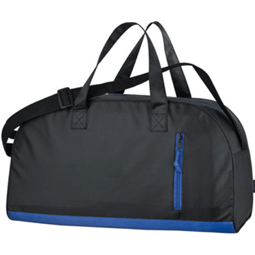 Sac de sport polyester 420D orné d'une bande de couleur et de fermeture éclair de couleur assortie, muni d'un large compartiment zippé, d'une poche verticale frontale zippée et de deux grandes poignées de transport avec une bandoulière ajustable.