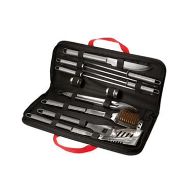 Set de 12 accessoires pour barbecue: fourchette, pince, spatule, brosse, 4 piques à brochette, salière et poivrière, housse de rangement, poignées de transport