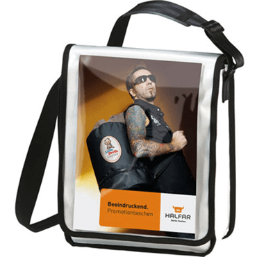 Sacoche.**Matière: Bâche de camion brillant.**Compartiment principal ouvert.**Poche rabat zippé.**Rabat transparent avec fermeture vélcro.**Bandoulière réglable avec épaulette.**Dimensions de l'article: 27 X 33 X 13 cm**