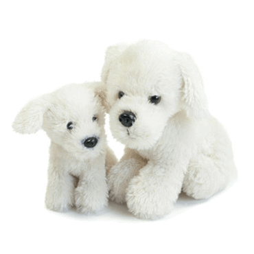 Sandy : petit chien beige avec oreilles tombantes. Patch : petit chien tacheté avec oreilles tombantes marron foncé.