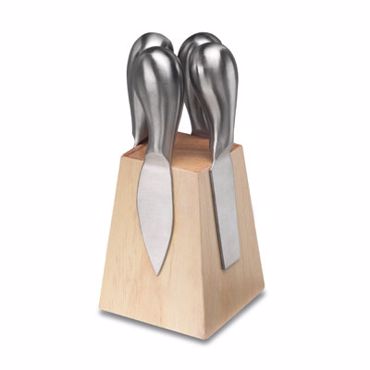 Service à fromage avec 3 couteaux différents et une fourchette aimantés sur un bloc de bois massif, acier, emballage individuel.