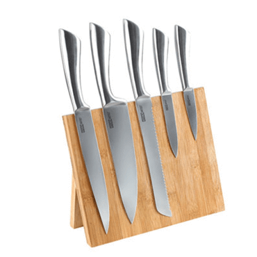 Set 5 couteaux sur bloc en bambou aimanté, manches et lames en acier inoxydable, couteau de chef 20 cm, couteau à découper 20 cm, couteau à pain 20 cm, couteau multi usages 12,5cm et couteau office 8,5cm, planche à découper 25 x 21,5 cm, couteaux compatibles lave-vaisselle