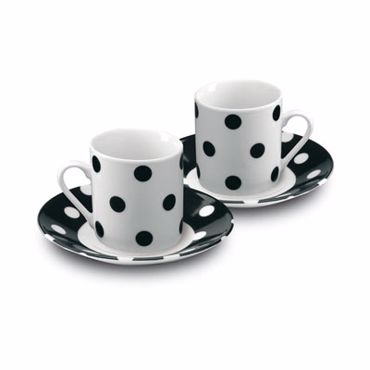 Set à café SEVILLA de 4 pieces Set pour café expresso comprenant 2 tasses et 2 soucoupes décorées de motif à poix. Présenté en boite de carton avec décoration assortie.