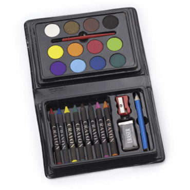 Set à dessin de 24 pièces comprenant des pastilles de peinture, des crayons gras, pinceau et taille-crayon.