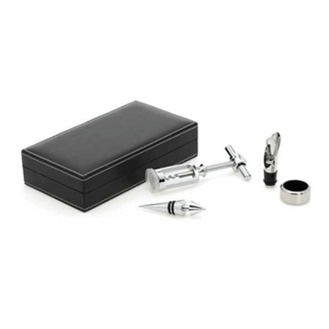 Set à vin. Simili cuir. Tire-bouchon, collier anti-gouttes, verseur anti-gouttes et bouchon. 227 x 127 x 54 mm
