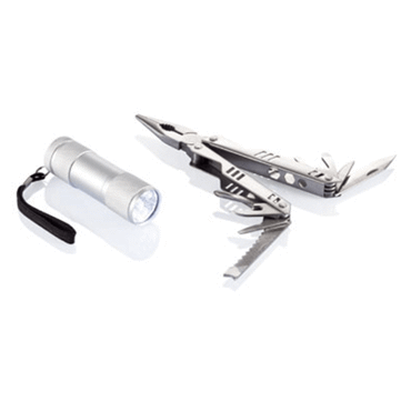Set comprenant une lampe de 9 led, pince en acier inoxydable 15 fonctions et pochette 600D, livré dans une boîte métal.
