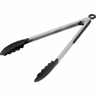 Pince pour barbecue en acier inoxydable et poignées en silicone.