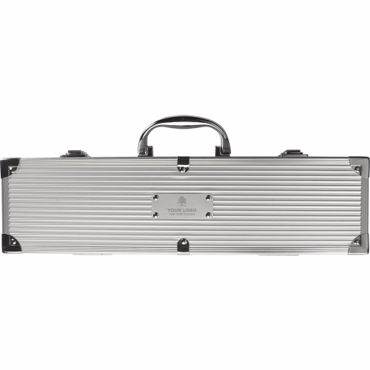 Set barbecue dans une malette en aluminium comprenant spatule, pince et fourchette à viande.