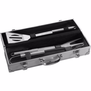 Set barbecue dans une malette en aluminium comprenant spatule, pince et fourchette à viande.