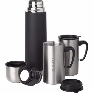 Set composé d'une bouteille isotherme double paroi en acier inoxydable d'une contenance de 0,50 l et 2 mugs de 0,30 l présentés dans une pochette zippée en polyester.