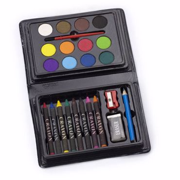 Set coloriage personnalisé. Set à dessin de 24 pièces comprenant des pastilles de peinture, des crayons gras, pinceau et taille-crayon.