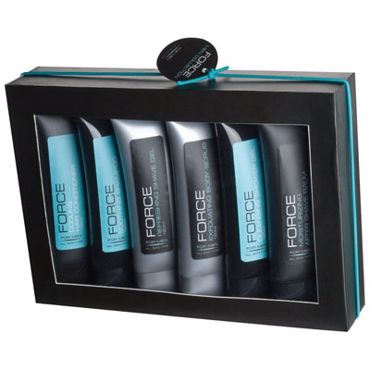 Set cosmétique homme. Set cosmétique de 6 pièces de ligne sportive FORCE pour homme comprenant 6 gels nettoyants . Marquage possible jusqu'à 4 couleurs sur une étiquette collée sur le packaging.