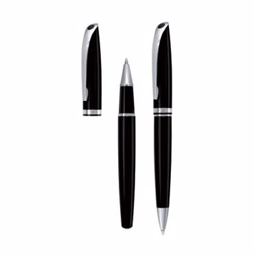 Set d'écriture BOHEMIAN Parure bille et roller en métal, finition noire et chromée brillante. Coffret cadeau noir avec application métal. Couleur écriture: Bille bleue, roller noire.