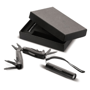 Set d'outils dans un coffret noir. Contient: lampe métal avec bouton poussoir et pile AA. Pince multifonction avec différents tournevis et couteaux.