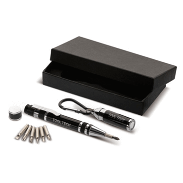 Set d'outils dans un coffret noir. Contient: support métallique en forme de stylo, avec huit différents tournevis. Ceux-ci sont dans le stylo. Lampe incluse, fonctionnant par bouton-poussoir.