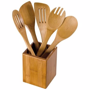 Set d'ustensiles bambou. Ce set d'ustensiles de 6 pcs en bambou est composé d'une spatule, d'une cuillère, d'un service à salade 2 pcs, d'une grande fourchette à viande et de son support pour ranger le tout dans votre cuisine.
